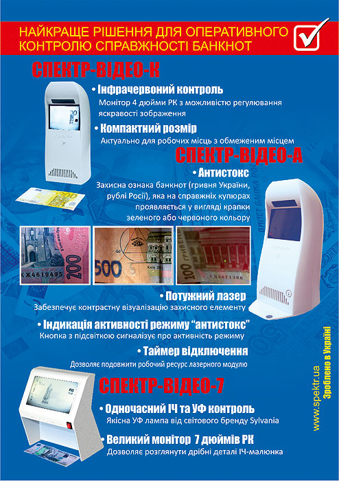 Інфрачервоні детектори банкнот Спектр-Відео-К укомплектовані якісними рідко-кристалічними дисплеями і розрізняються за габаритними розмірами та величиною монітору (діагональ 4 або 7 дюймів). Виходячи з цього, є можливість вибору їх для конкретного робочого місця.